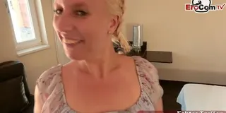 The chubby blonde Jana Schwarz lets the fucker Gino Gemelli film her during her sex date. The ugly slut with blonde hair is not the prettiest. But she likes blind dates for sex. Which is why she starts sucking the man's cock in a nearby park. Because she is particularly good at oral sex. Afterwards she goes to the hotel, where she lets her pussy be penetrated in front of the camera.