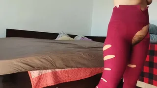 Une femme amateur s'amuse à essayer des vêtements et à les couper. Une femme amateur danse nue dans