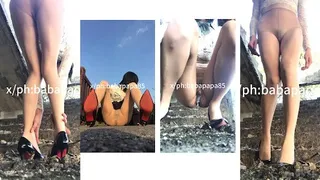 sissy in white hollow top peeing by the river