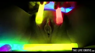 Watch this hot blonde plunge glowsticks in her pussy and ass